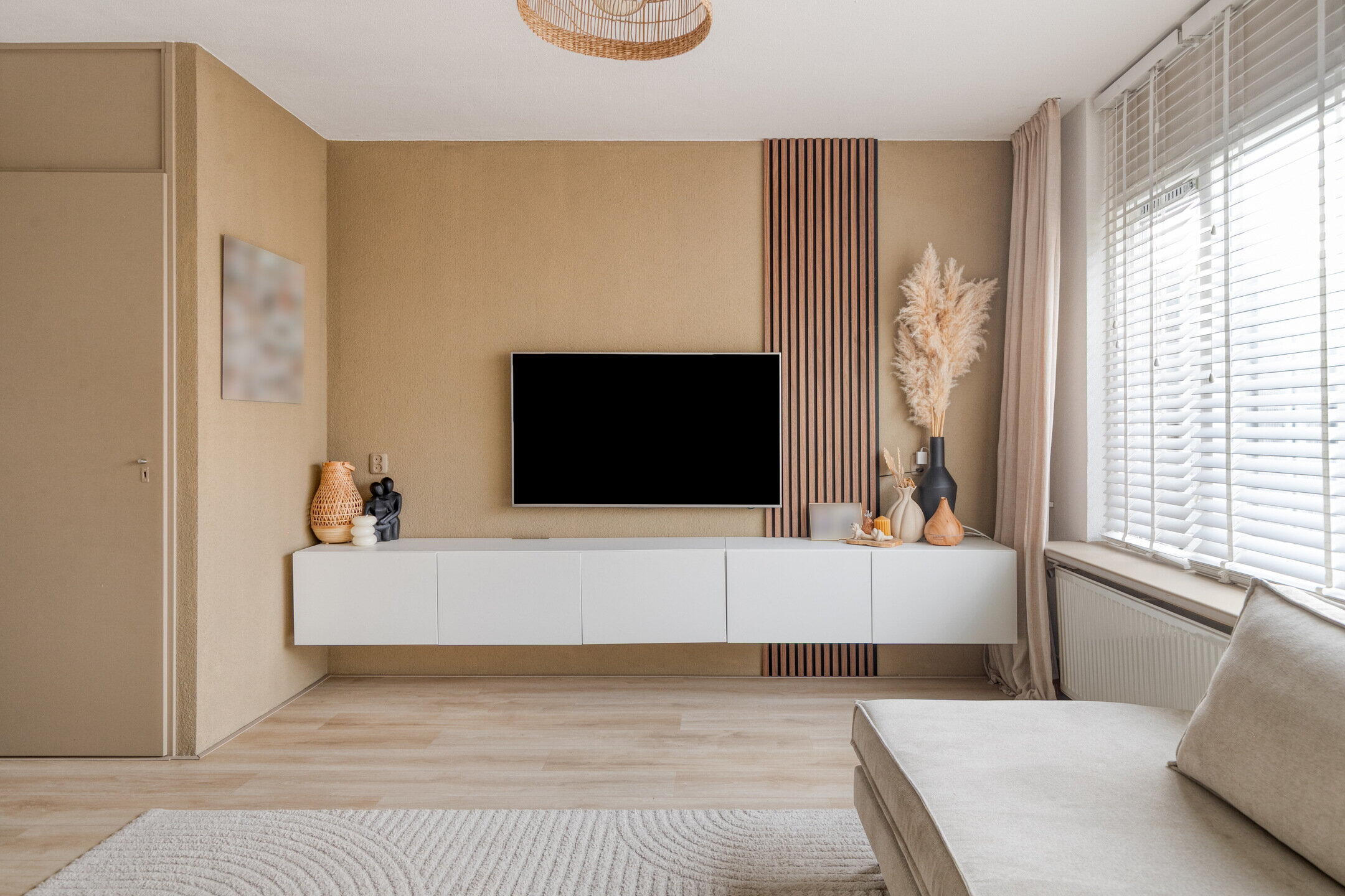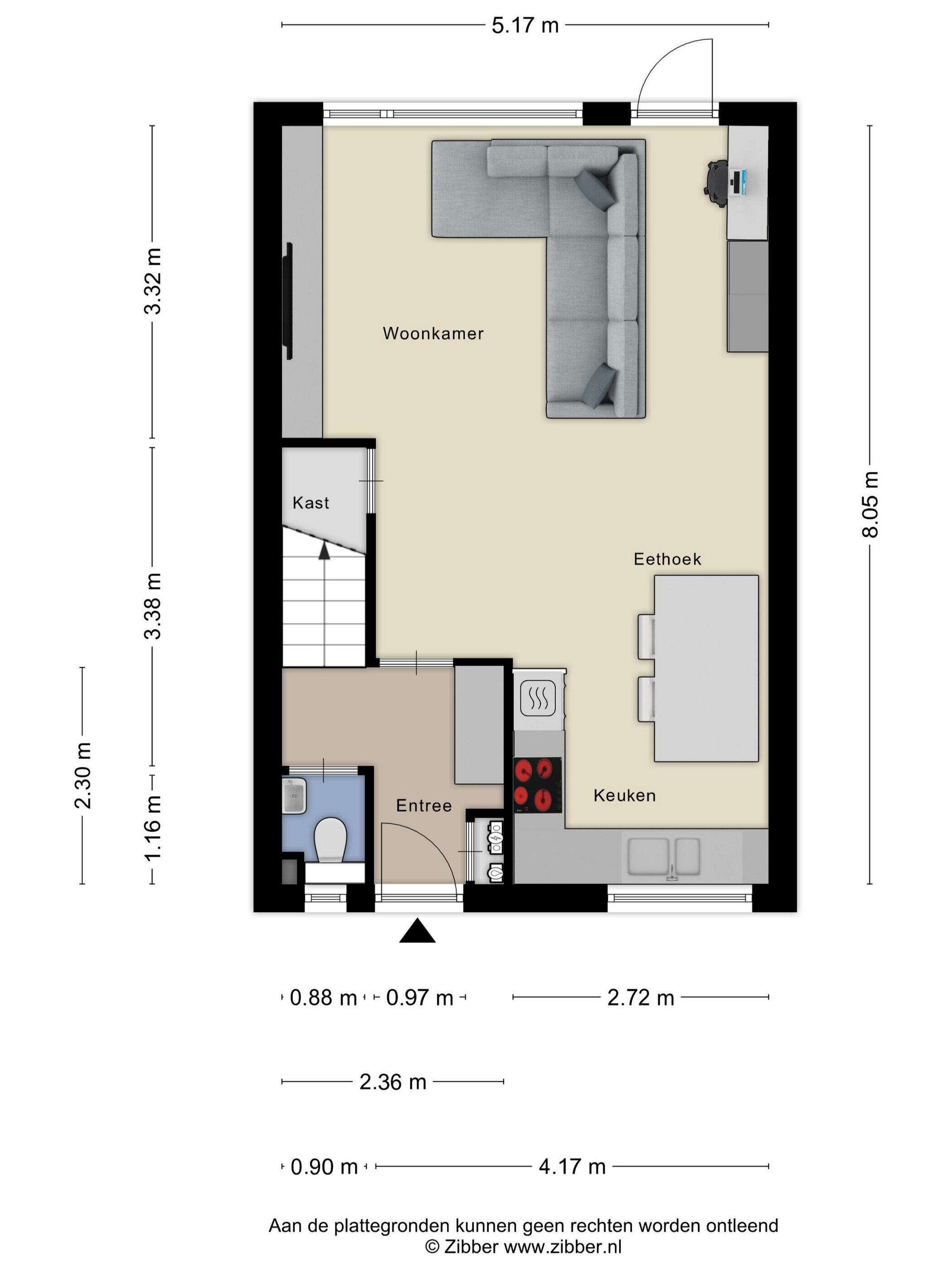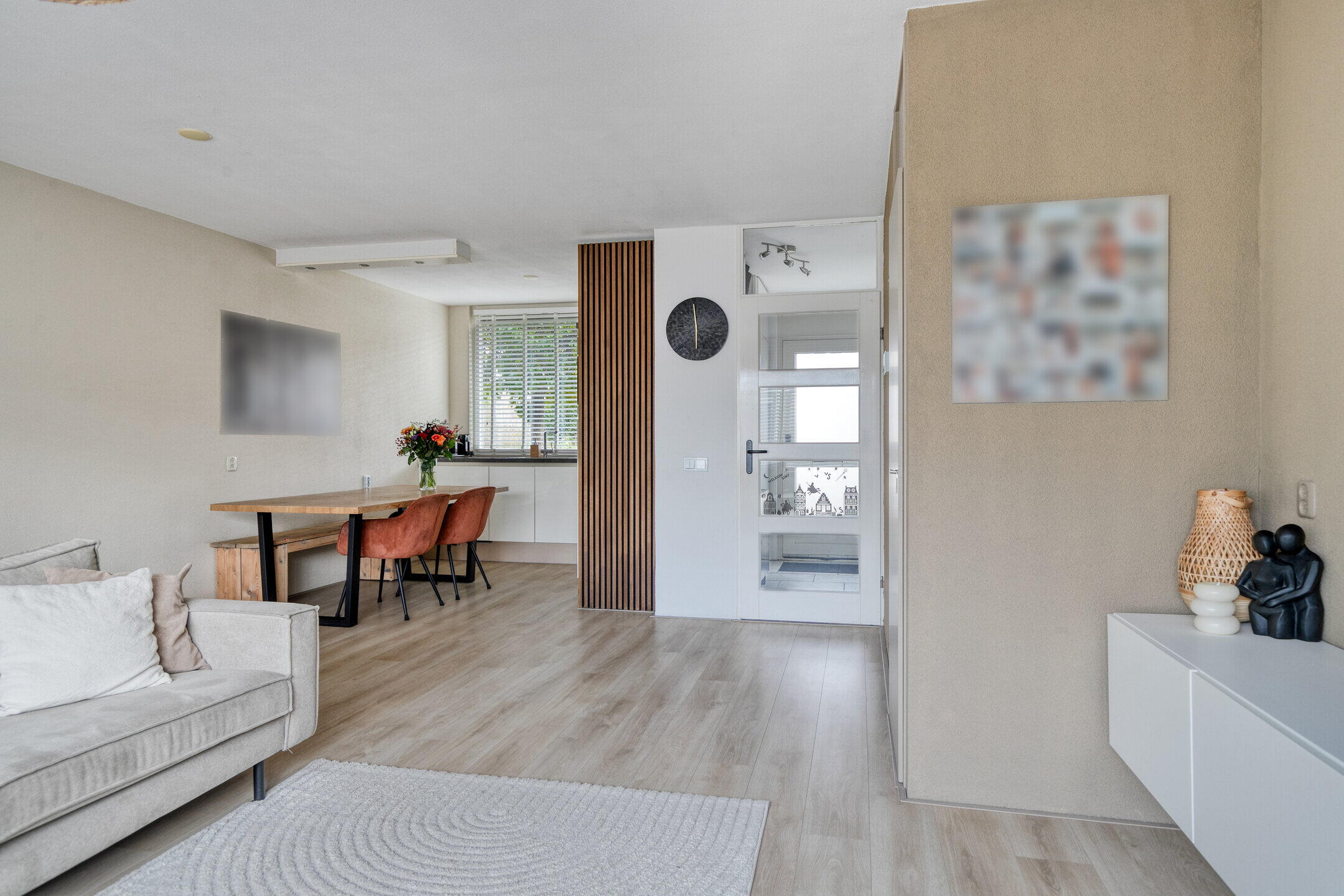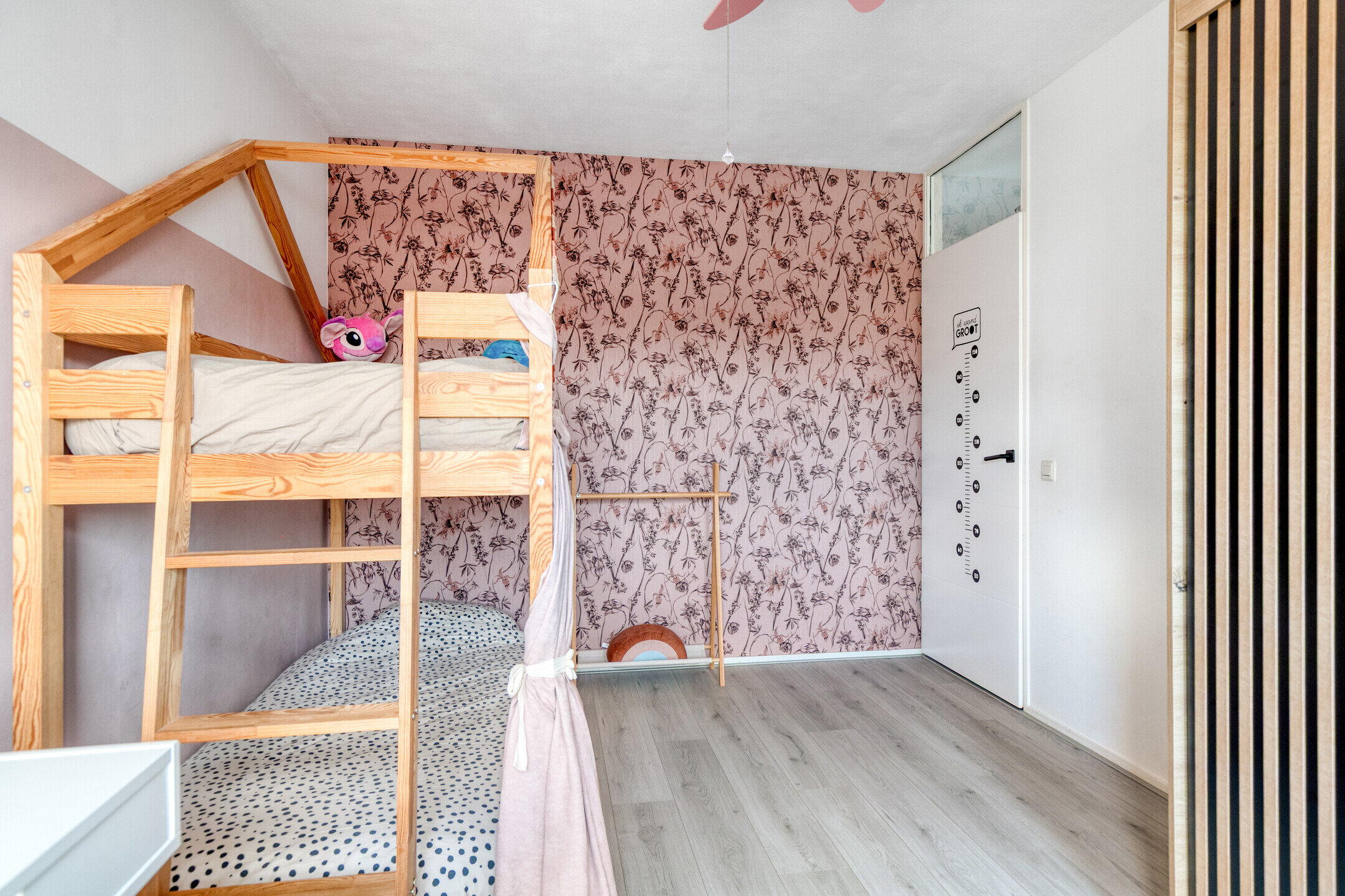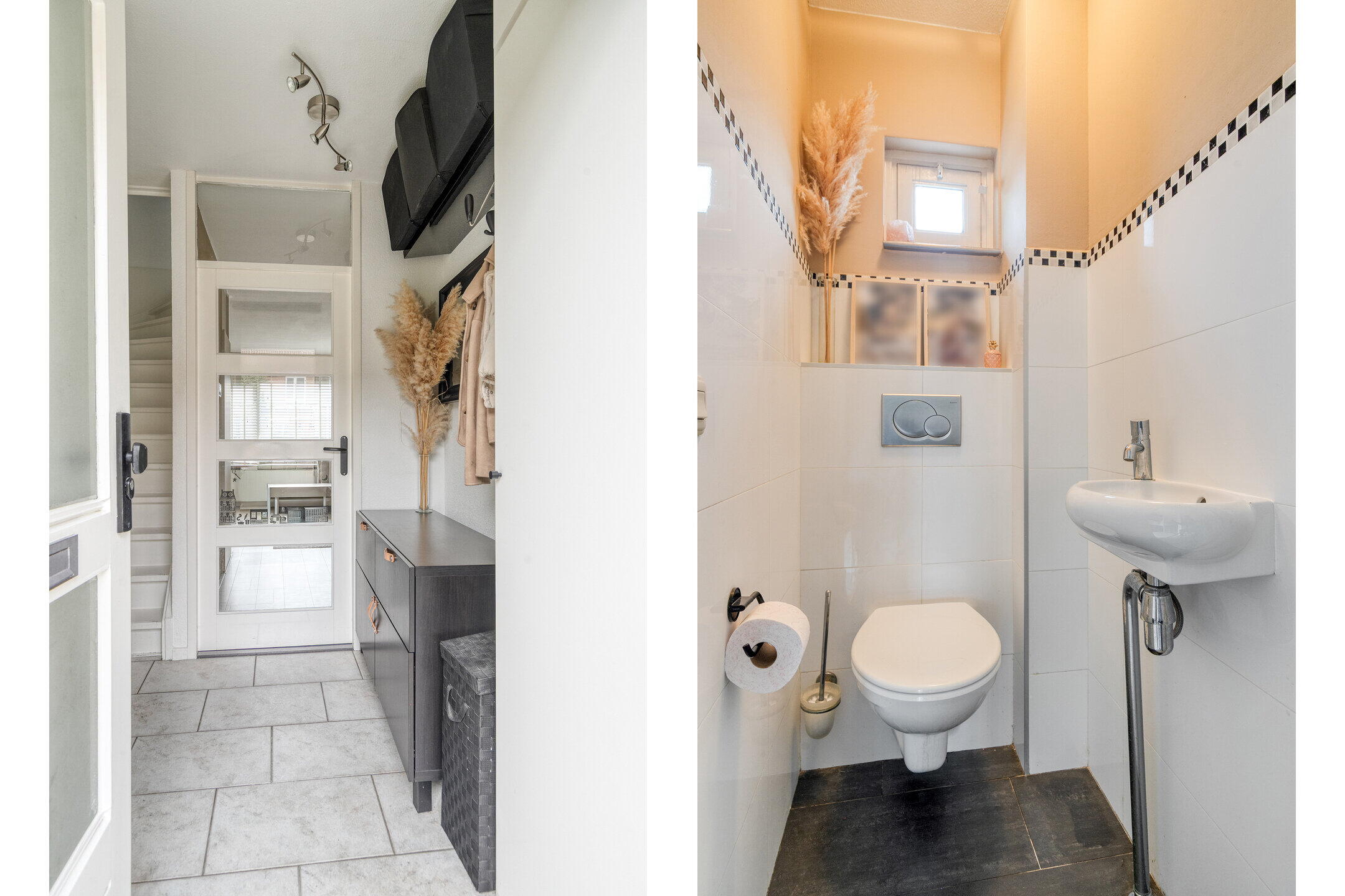 Je komt binnen via de nette entree van de woning. Hier tref je direct een modern en verzorgd toilet, én een vaste trap die je naar de eerste verdieping leidt. De sfeer voelt gelijk goed: netjes, fris en uitnodigend.