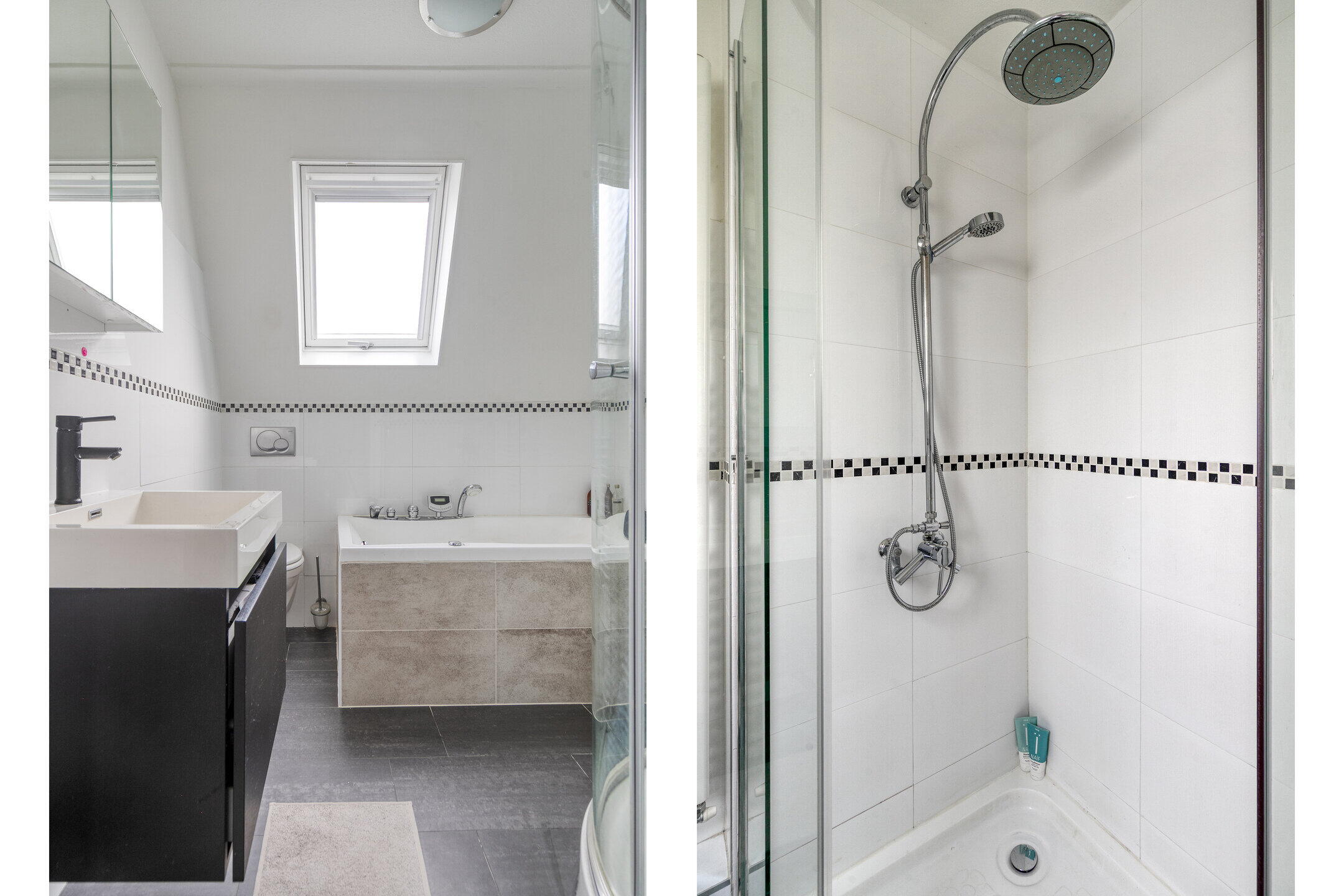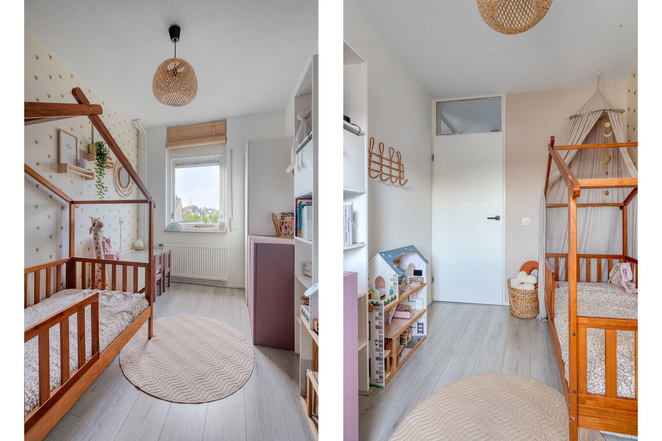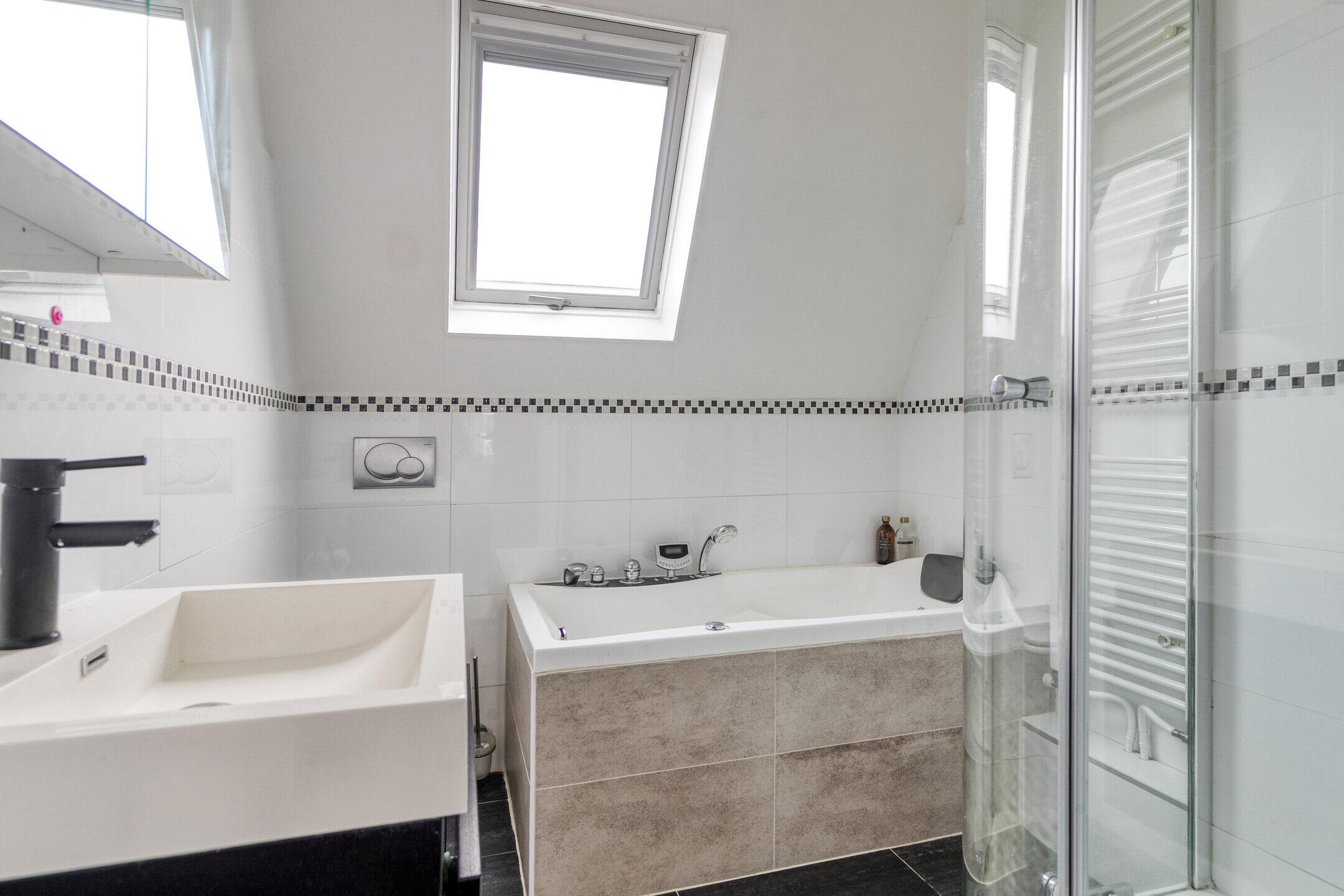 Op de eerste verdieping zijn drie ruime slaapkamers, allemaal keurig afgewerkt en voorzien van lekker veel lichtinval. De badkamer is modern en compleet: een ligbad, inloopdouche, wastafelmeubel én een stijlvolle combinatie van donkere vloertegels en lichte wandtegels zorgen voor een frisse en luxe uitstraling. Op de tweede verdieping vind je de vierde slaapkamer. Ook deze is ruim, licht en biedt fijne hoekjes om gezellig in te richten. Dankzij ingebouwde kastruimte houd je het hier makkelijk netjes. Op de overloop is een praktische opstelplek voor de wasmachine en droger.