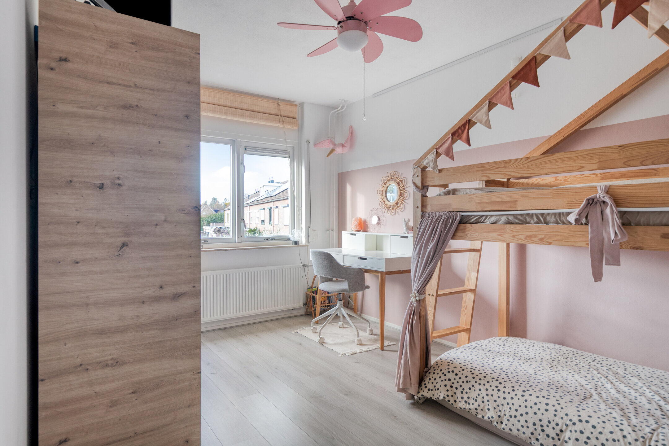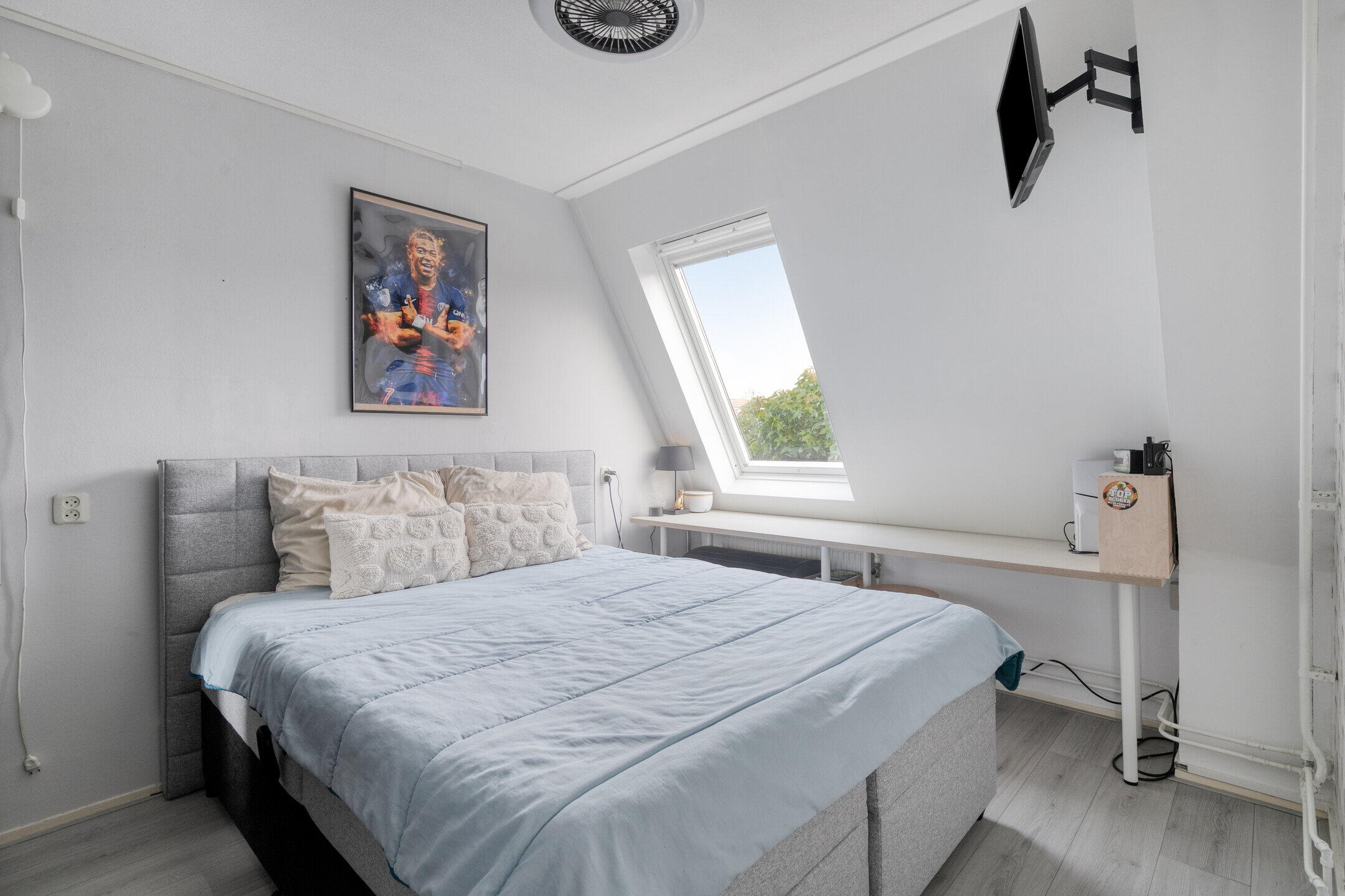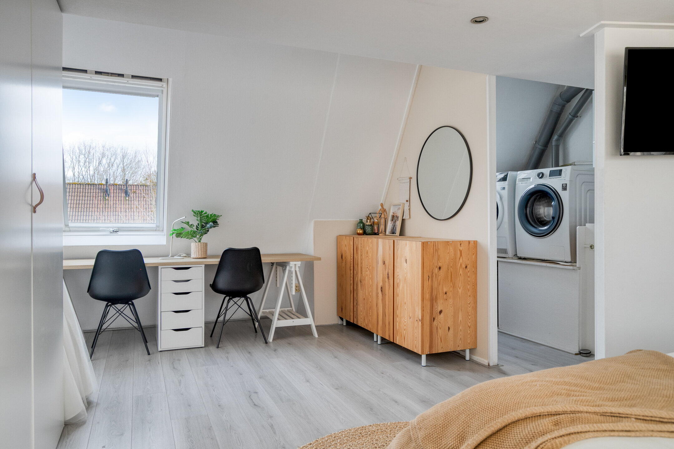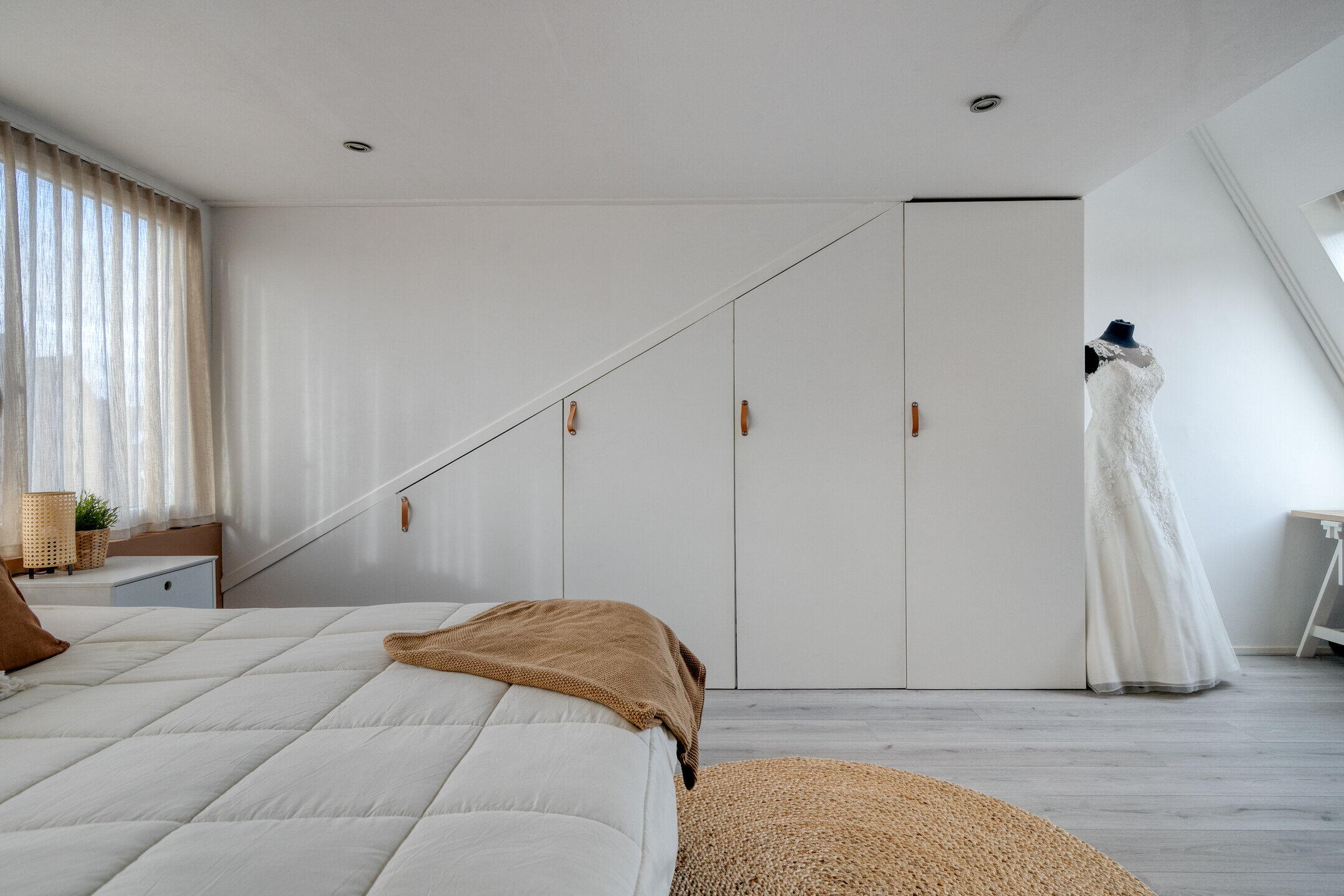 Op de eerste verdieping zijn drie ruime slaapkamers, allemaal keurig afgewerkt en voorzien van lekker veel lichtinval. De badkamer is modern en compleet: een ligbad, inloopdouche, wastafelmeubel én een stijlvolle combinatie van donkere vloertegels en lichte wandtegels zorgen voor een frisse en luxe uitstraling. Op de tweede verdieping vind je de vierde slaapkamer. Ook deze is ruim, licht en biedt fijne hoekjes om gezellig in te richten. Dankzij ingebouwde kastruimte houd je het hier makkelijk netjes. Op de overloop is een praktische opstelplek voor de wasmachine en droger.