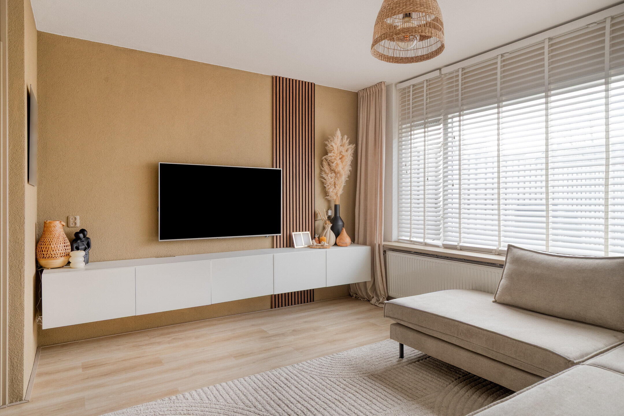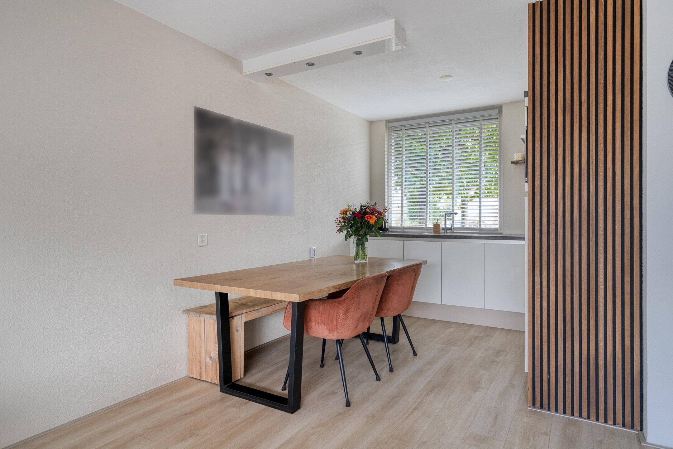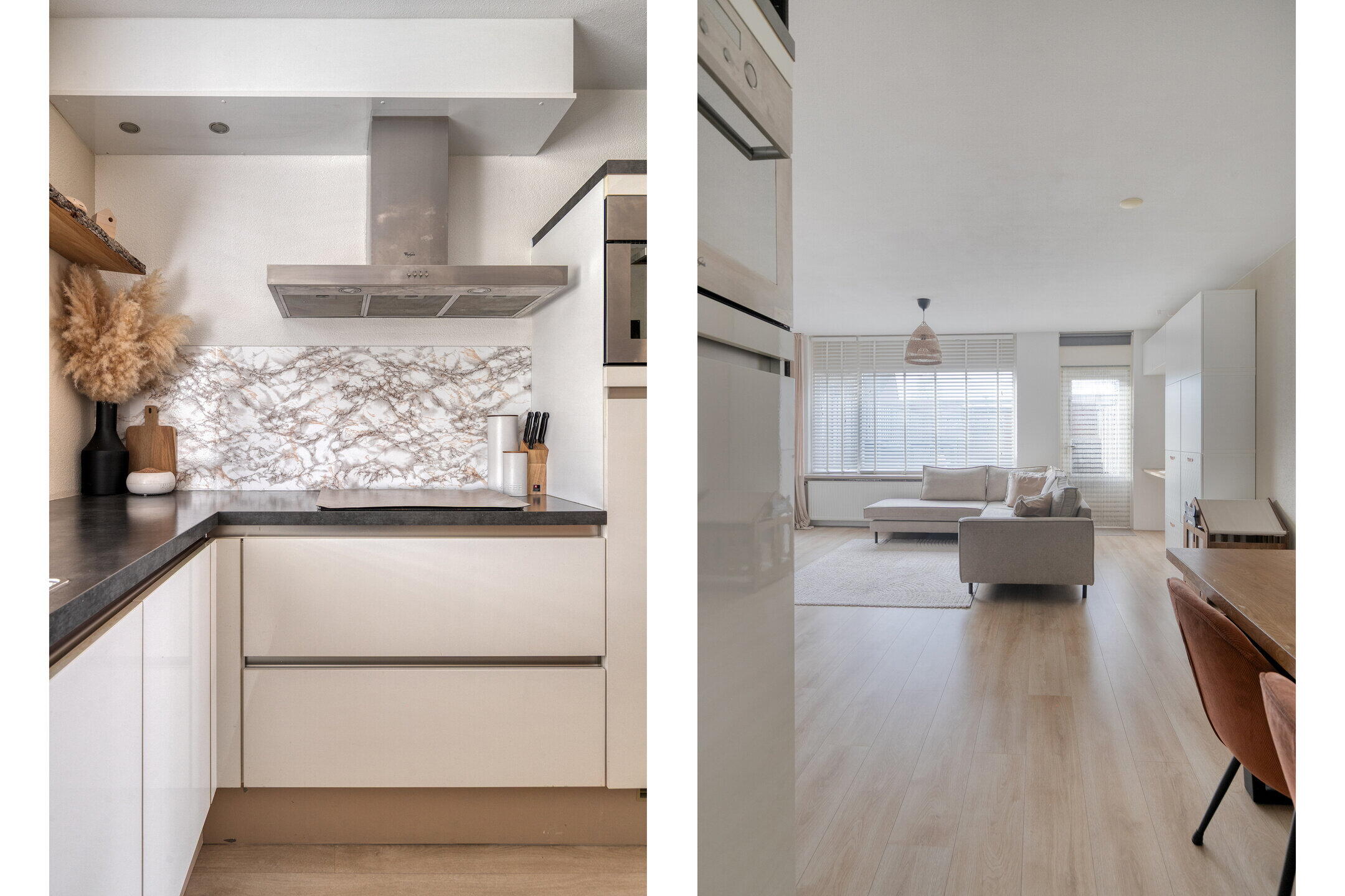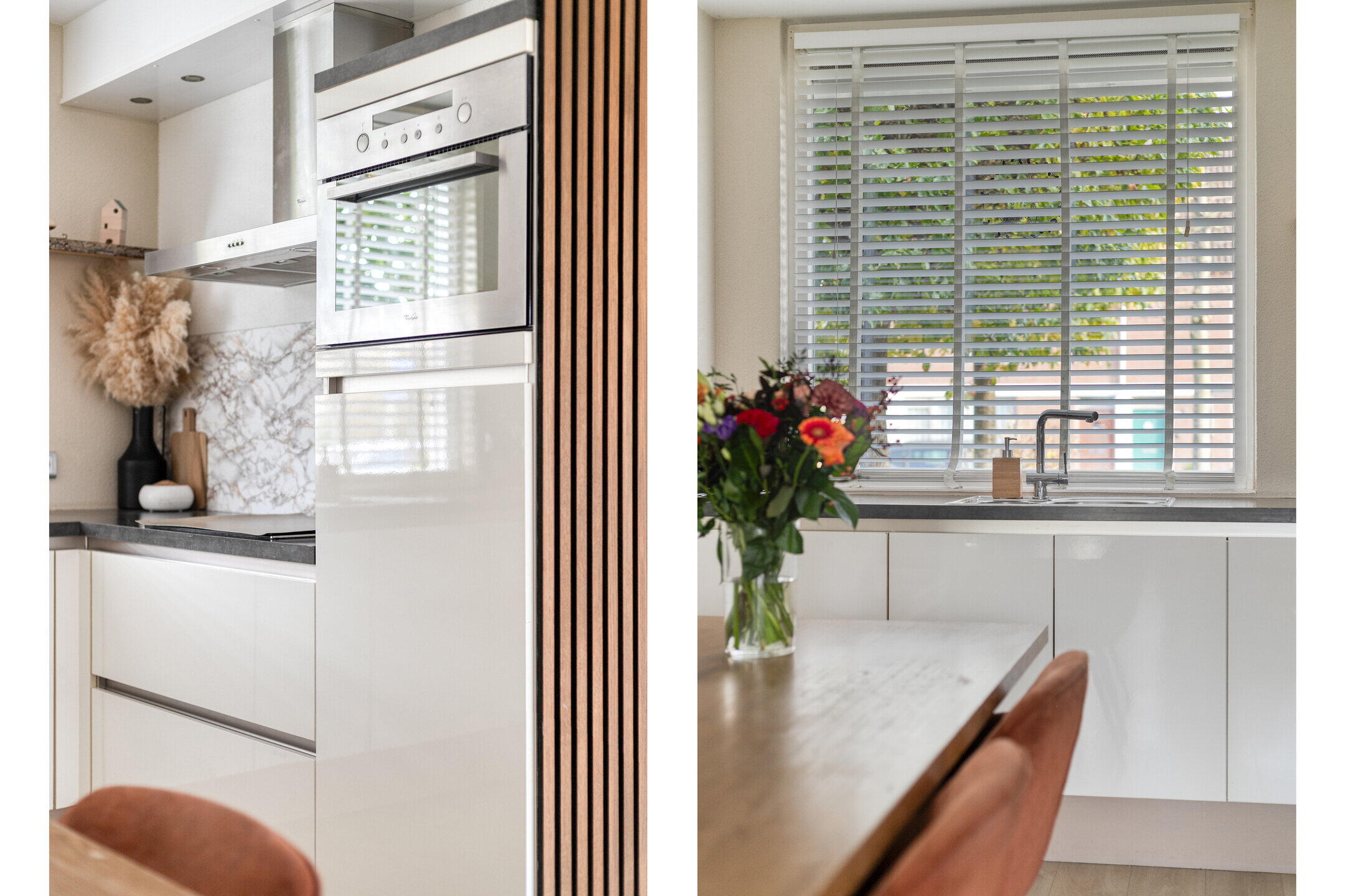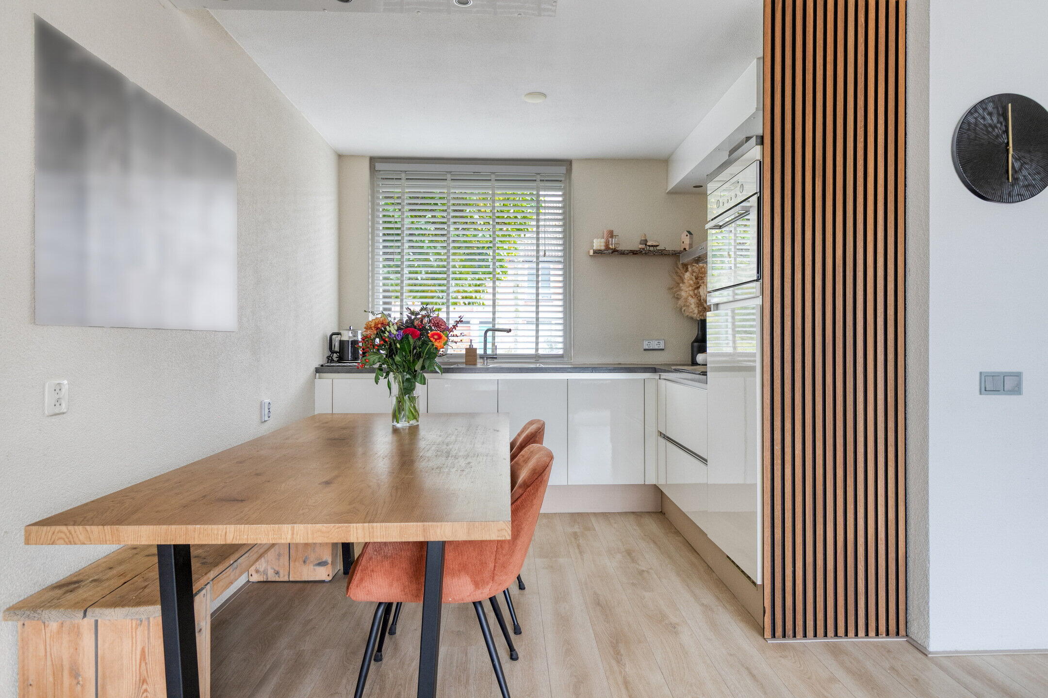 De woonkamer is echt een plaatje: warm, modern en boordevol licht dankzij de grote raampartijen. De ruimte is slim ingedeeld met aan het einde een gezellige zithoek om lekker te ontspannen, tv te kijken of te relaxen met een boek. Ook is er een fijne werkplek gecreëerd – ideaal voor thuiswerkers! De woonkamer loopt vloeiend over in de eethoek en moderne keuken, waardoor het geheel ruim en verbonden aanvoelt. De keuken is strak en tijdloos afgewerkt met witte kasten, een donker keukenblad en moderne inbouwapparatuur zoals een inductiekookplaat. Hier kook je met plezier!